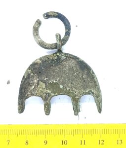 Chain holder, copper alloy. This type of chain-holder is also referred to as segment- or crescent-shaped chain holders. In the material from Salaspils Laukskola cemetery in Latvia, such chain holders appear together with pins dated to the 10th–11th centuries (Zarina 2006, 259–261).
