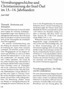 Mäll, J. 1998. Verwaltungsgeschichte und Christianisierung der Insel Osel im 13-14. Jahrhundert. – Culture clash or compromise? The Europeanisation of the Baltic Sea Area 1100-1400 AD. Papers of the XI Visby Symposium held at Gotland Centre for Baltic Studies, Gotland University College, Visby October 4″ – 9″, 1996. Acta Visbyensia, XI. Visby, Ik. 158-165.