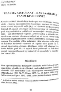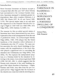 Pärn, A., Russow, E. 2005. Kaarma parsonage in Saaremaa – a local nobleman’s manor or a fortified dwelling of a conqueror? In: Praeities puslapiai: archeologija, kultūra, visuomenė. (49−70). Klaipėda: Klaipedos universiteto Baltijos regiono istorijos ir archeologijos institutas: Klaipedos universit.